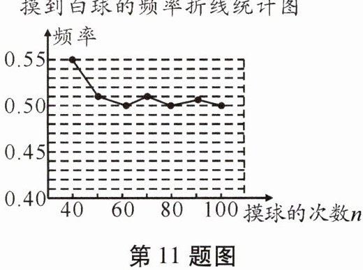 11. 在一个不透明的盒子里装有除颜色不同外其他都相同的黑、白两种球共$40$个,小颖做摸球试验,她将盒子里面的球搅匀后从中随机摸出一个球记下颜色,再把它放回盒子中,不断重复上述过程,如图是摸到白球的频率折线统计图。