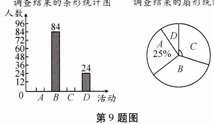 9. 某学校为全校$960名学生提供了A,B,C,D$四种课外活动,为了解学生对这四种课外活动的喜好情况,学校随机抽取$240$名学生进行了“你最喜欢哪一种课外活动(必选且只选一种)”的问卷调查,并根据调查结果绘制了如图所示两幅不完整的统计图。