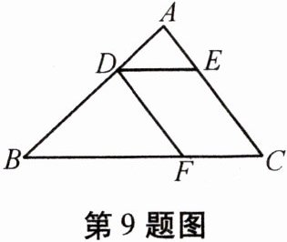 9. 如图,$ DE // BC $,$ DF // AC $,$ AD = 4cm $,$ BD = 8cm $,$ DE = 5cm $,求线段 $ BF $ 的长。
