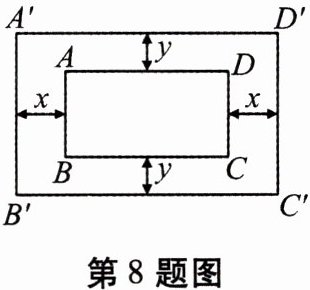 8. 如图,矩形花坛 $ ABCD $ 的宽 $ AB = 20 $ 米,长 $ AD = 30 $ 米. 现计划在该花坛四周修筑小路,使小路四周所围成的矩形 $ A'B'C'D' \sim $ 矩形 $ ABCD $,并且相对两条小路的宽相等,试问小路的宽 $ x $ 与 $ y $ 的比值是多少?