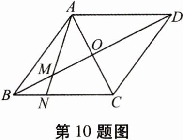 10. 如图,在菱形$ABCD$中,$AC交BD于点O$,点$M为OB$的中点,连接$AM并延长交BC于点N$,若$AC= 12$,$BN= 2\sqrt{5}$,则$AN= $