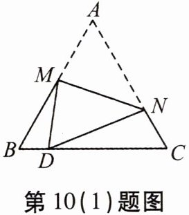 10. (1)如图,将边长为4的等边三角形ABC沿MN折叠,点A恰好落在BC边上的点D处,已知AM:AN = 2:3,则CD的长为