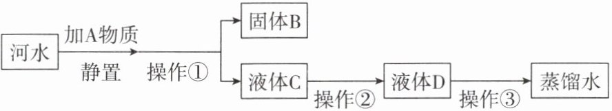 9. 暴雨过后的河水浑浊不堪,化学兴趣小组的同学收集到一瓶浑浊的河水,经过以下净水过程,最终制成蒸馏水,实验过程如图所示。