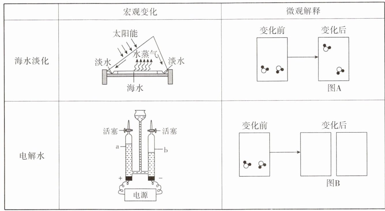(5) 从外观看,海水淡化和电解水都有液态变成气态的过程,但二者有本质的不同。请从微观粒子的角度图示这种区别,完成图 B。
