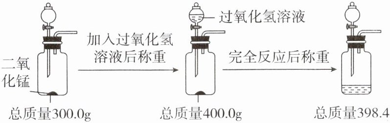 (2)解:由题干数据可知,加入过氧化氢溶液的质量为400.0g-300.0g=100.0g。设生成1.6g氧气需要过氧化氢的质量为x,则: