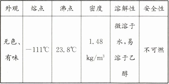 |无色、有味|-111℃|23.8℃|$1.48kg/m^3$|微溶于水,易溶于乙醇|不可燃|