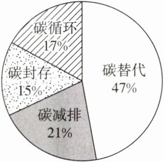 $CO_2$是另一种温室气体,减少$CO_2$的排放,实现碳中和,已成为全球共识。碳替代、碳减排、碳封存、碳循环是实现碳中和的4种主要途径。科学家预测,到2050年,4种途径对全球碳中和的贡献率如图所示。