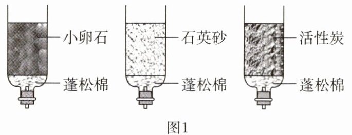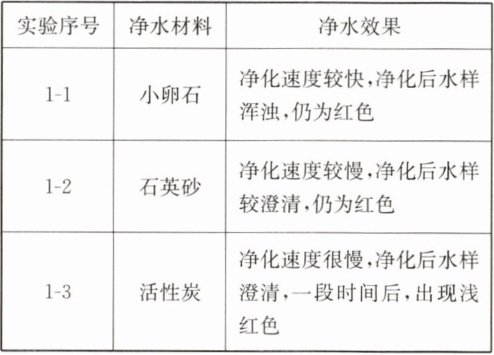 实验1:分别将等量不同材料装填入装置(见图1),对100mL河水(预先滴入1滴红墨水)进行净化。实验记录如下: