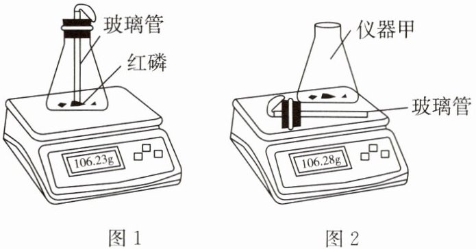 5. 悦悦用图 1 所示装置验证质量守恒定律。点燃红磷前电子天平示数为 106.23g(见图 1)。验证质量守恒定律后,待白烟完全沉降取下橡胶塞,片刻后再一起称量,电子天平示数稳定为 106.28g(见图 2)。