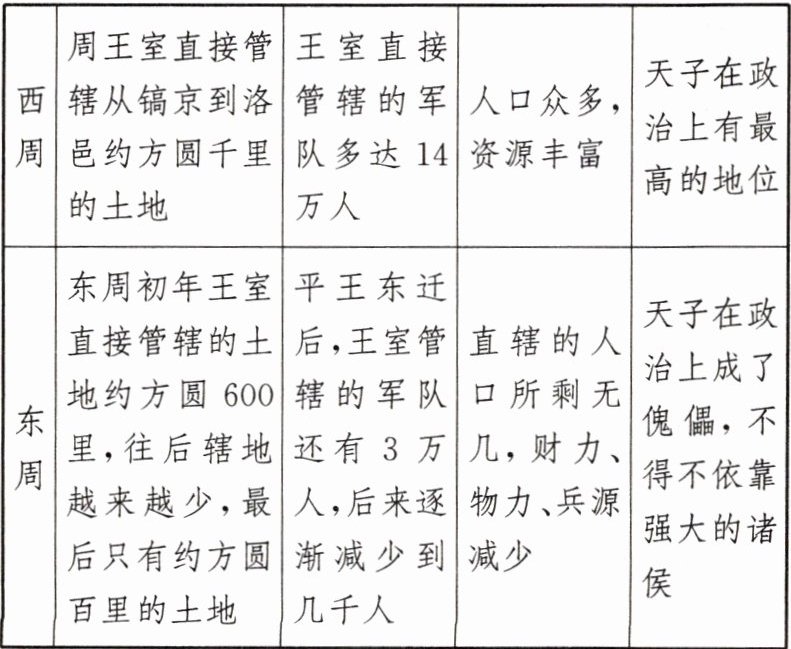 (2)题,对比西周和东周王室势力变化,可归纳变化方面即人口、土地、兵力、财力、物力;通过表格在人口、土地、兵力、财力、物力等方面的对比可以得出,东周王室势力变弱,这说明周王室衰微。第