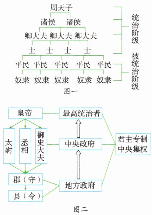(1)图一:西周分封制,图二:秦朝以皇帝为中心的中央集权制度。