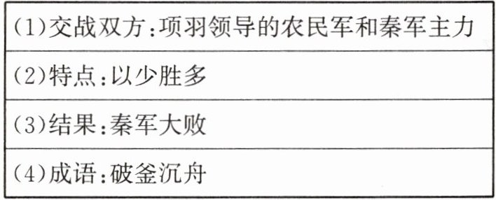 5.A 根据所学可知,公元前207年在巨鹿之战中,项羽以少胜多,歼灭秦军主力,为灭亡秦朝奠定了基础。