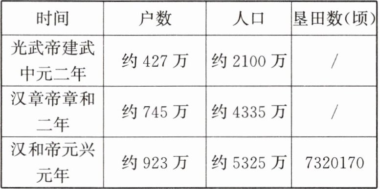 1. 下表呈现了东汉部分年份的人口与垦田变化情况。据此可以得出的结论是东汉初年(