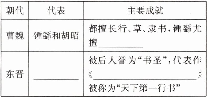 3.B 根据所学知识,东晋书法家王羲之将书法艺术提高到一个新高度,当时人们称赞他的书法为古今之冠。他的代表作《兰亭集序》被称为“天下第一行书”,B 正确;我国有文字可考的历史从商朝开始,排除 A;继承了雕塑艺术的优良传统与材料不符,材料是书法作品,不属于雕塑,排除 C;材料不是诗歌,无法体现田园诗清新自然的特点,排除 D。