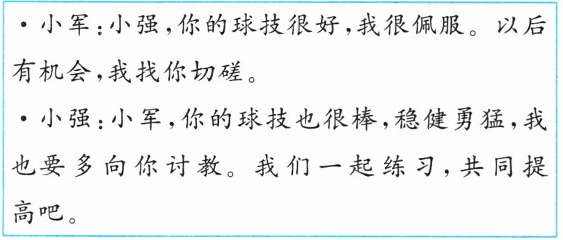 • 小军:小强,你的球技很好,我很佩服。以后有机会,我找你切磋。