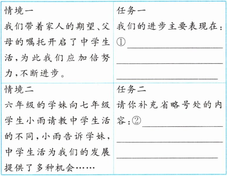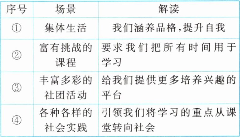 (2)①越来越上进,志存高远,追梦远航;越来越踏实,努力学习,勤于思考;越来越包容,尊重他人,学会合作;越来越坚强,能坚持,有韧劲,取得更大进步。②富有挑战的课程和学习任务,带领我们探索新的知识领域;丰富多彩的社团活动,给我们提供更多培养兴趣的平台;各种各样的社会实践,为我们打开认识社会的大门;等等。