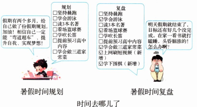 9.(2024·重庆中考A卷)时间从来不语,却能回答所有问题。它是公平的,不会给任何人多一分,也不会给任何人少一秒;它也是有偏向的,惜时如金者会得到时间的奖励,虚掷光阴者会徒留惆怅。下列为某中学生暑假的时间规划和复盘,请你阅读,并回答问题。