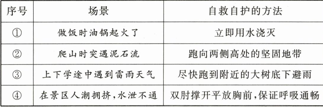 7.D 本题考查提高避险和逃生能力。做饭时油锅起火了应该立即盖上锅盖,隔绝空气灭火,或使用灭火器灭火,①错误;遇到雷雨天气在大树底下避雨,人很可能会因为跨步电压而触电,存在很大的安全隐患,正确的做法是尽快进入有防雷设施的建筑物内躲避,或寻找低洼地带双脚并拢蹲下,③错误;爬山时突遇泥石流,跑向两侧高处的坚固地带可以避免被泥石流冲走,②正确;在人潮拥挤的情况下,双肘撑开平放胸前可以在身体周围形成一定的空间,保证呼吸通畅,防止因拥挤而导致窒息等危险情况发生,④正确。