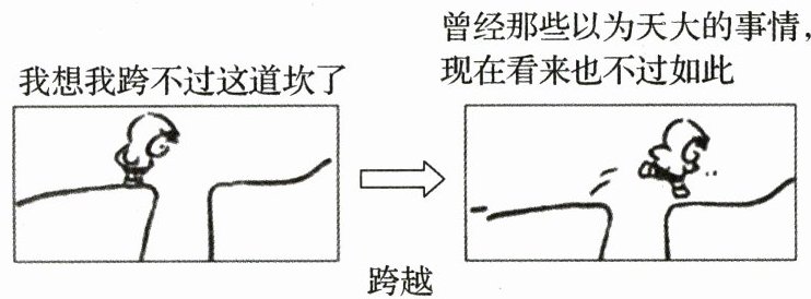 14.A 本题考查对待挫折的正确态度。漫画《跨越》告诉我们,人生难免有挫折,我们要正确对待挫折,增强生命韧性,A符合题意;漫画的主旨是正确面对挫折,没有体现生命是短暂的、爱护身体、敬畏生命等内容,B、C、D不符合题意。