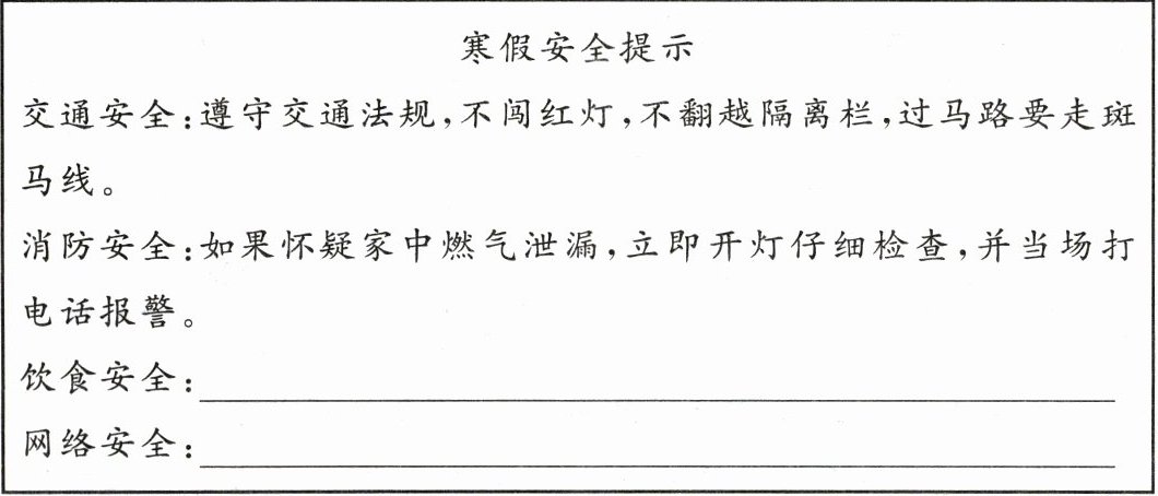 参加完消防知识活动后,七年级(1)班学以致用,考虑到寒假将至,为了让同学们度过一个安全的假期,班委拟写了一份《寒假安全提示》。