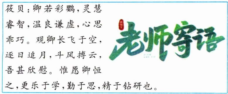 4.B 本题考查正确对待老师的表扬和批评。图片中老师对筱贝的评语既有表扬和肯定,也有激励和希望,这都是关爱学生的表现,我们要正确对待老师的表扬与劝导,理解老师的良苦用心,①④说法正确;这些评语并没有偏离教学的工作重心,②说法错误;题干中没有体现传道授业的学科素养,③不合题意。