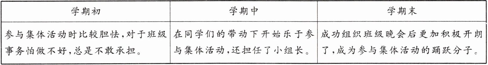 2.A 本题考查集体的作用。东东同学从学期初的胆怯到担任小组长,再到成为集体活动踊跃分子,体现了集体生活培养责任感,发展个性,①②符合题意。材料没有体现学会处理与他人的关系,③排除。④“唯一”说法绝对,排除。