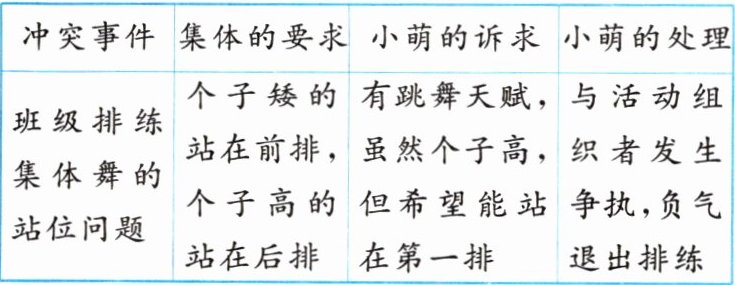 6. 在集体生活中,“我”和“你”可能有着不同的诉求,有时难免发生碰撞,产生矛盾和冲突。下表内容是小萌与集体发生冲突的经过:
