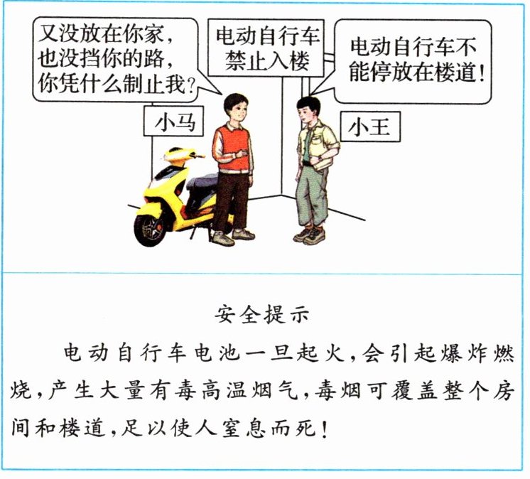 6.C 本题考查树立规则意识、增强风险意识。小马没有认识到电动自行车入楼的危害,对自身行为没有作出恰当的评估,C错误;提醒小马电动自行车不能停放在楼道说明小王具有较强的风险意识,能够对潜在危险作出科学判断,可以防患于未然,A、B正确;楼道中有“电动自行车禁止入楼”的标识,小马仍将电动自行车推入楼道,说明小马没有自觉遵守规则,没有树立规则意识,D正确。