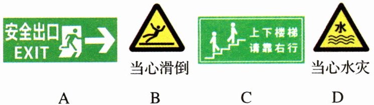4.B 本题考查增强安全意识。依据题文描述,适合在学校操场张贴的安全标志是“当心滑倒”的提示语,B正确;安全出口、上下楼梯请靠右行、当心水灾等不适合在操场张贴,A、C、D不符合题意。