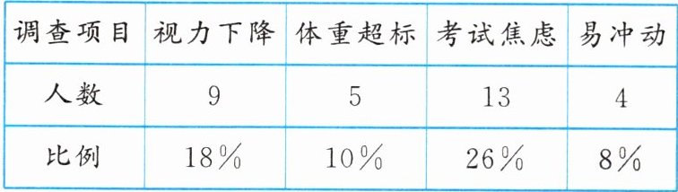 7. 下列是某班同学针对七年级 50 名同学的身心发展状况开展的调查,数据如下: