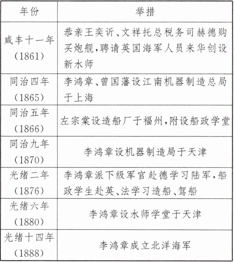(2)方式:聘请外国人才、创办军事工业、设立专门学校、派遣留学生、成立近代海军等。