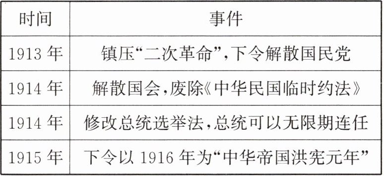1. 帝制复辟:袁世凯强迫国会选举他为正式大总统→解散国民党和国会→废除《中华民国临时约法》,颁布《