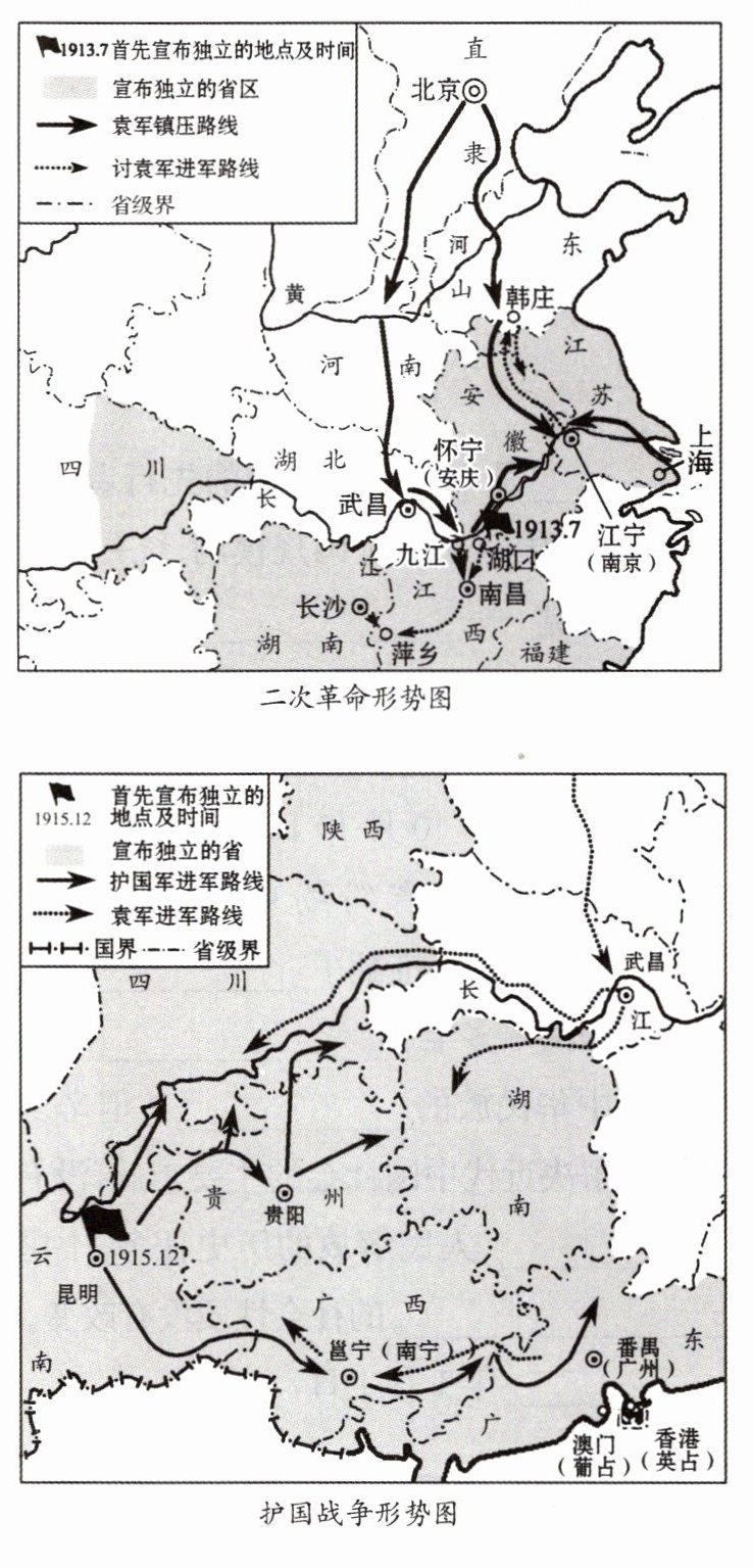 9.D 根据题干形势图信息和所学可知,以孙中山为首的革命党人,为反对袁世凯的倒行逆施进行了不懈斗争,主要包括二次革命、护国战争、护法运动等。