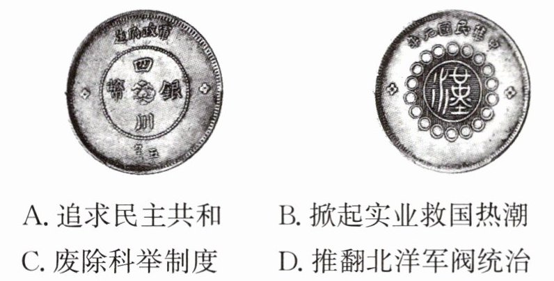 5.A 根据材料“银币背面上方铸‘中华民国元年’,中间镌刻的篆书‘汉’字取代了惯例使用的代表封建帝制皇权的蟠龙图案”及所学可知,辛亥革命推翻了清王朝的统治,宣告了两千多年的君主专制制度的终结,促进了民主共和观念的传播。