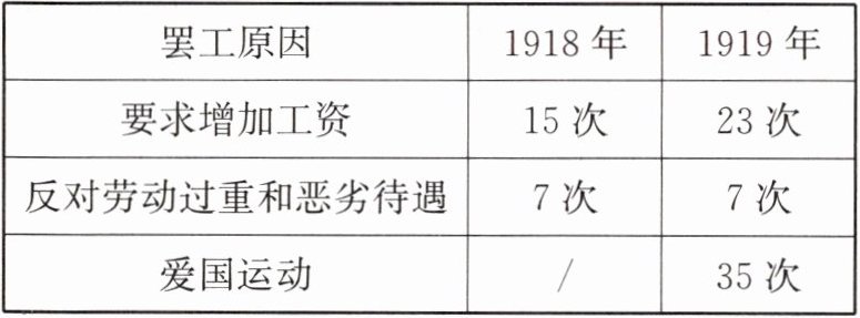 D 根据题干中“1918—1919年”,表格信息中工人为争取合法权益的罢工次数增加,尤其是以“爱国运动”为罢工理由的罢工从无到次数激增。结合所学,五四运动之后,中国工人阶级的觉悟得到了显著提高,工人阶级政治斗争的意识逐渐增强,工人运动也愈发活跃,D正确。A、B、C在题目信息中不能体现。