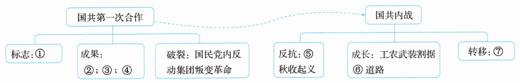 | 标志:① | 成果:②;③;④ | 破裂:国民党内反动集团叛变革命 | 反抗:⑤秋收起义 | 成长:工农武装割据⑥道路 | 转移:⑦ | |