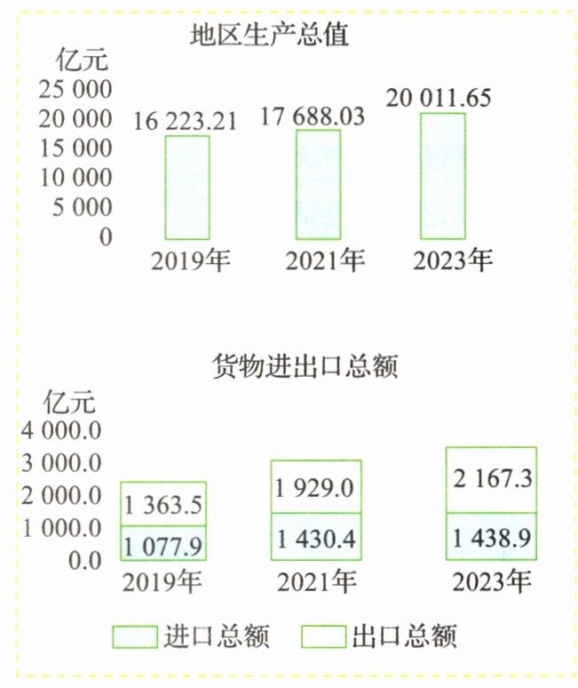 1.D 本题考查改革开放是决定当代中国命运的关键抉择、经济发展的新阶段。从2019—2023年武汉市货物进出口总额、地区生产总值两组数据可以看出,武汉市坚持推进对外开放,经济发展成效显著,D符合题意;题文中的数据没有反映区域协调发展、加快制度创新的观点,A、B不符合题意;我国经济已由高速增长阶段转向高质量发展阶段,C说法错误。