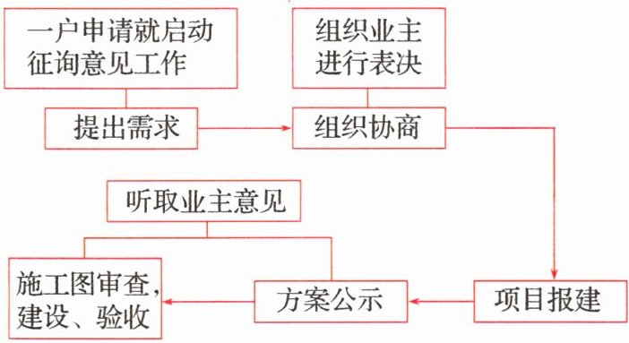 ③施工建设听取业主意见→施工单位向居民会议汇报工作