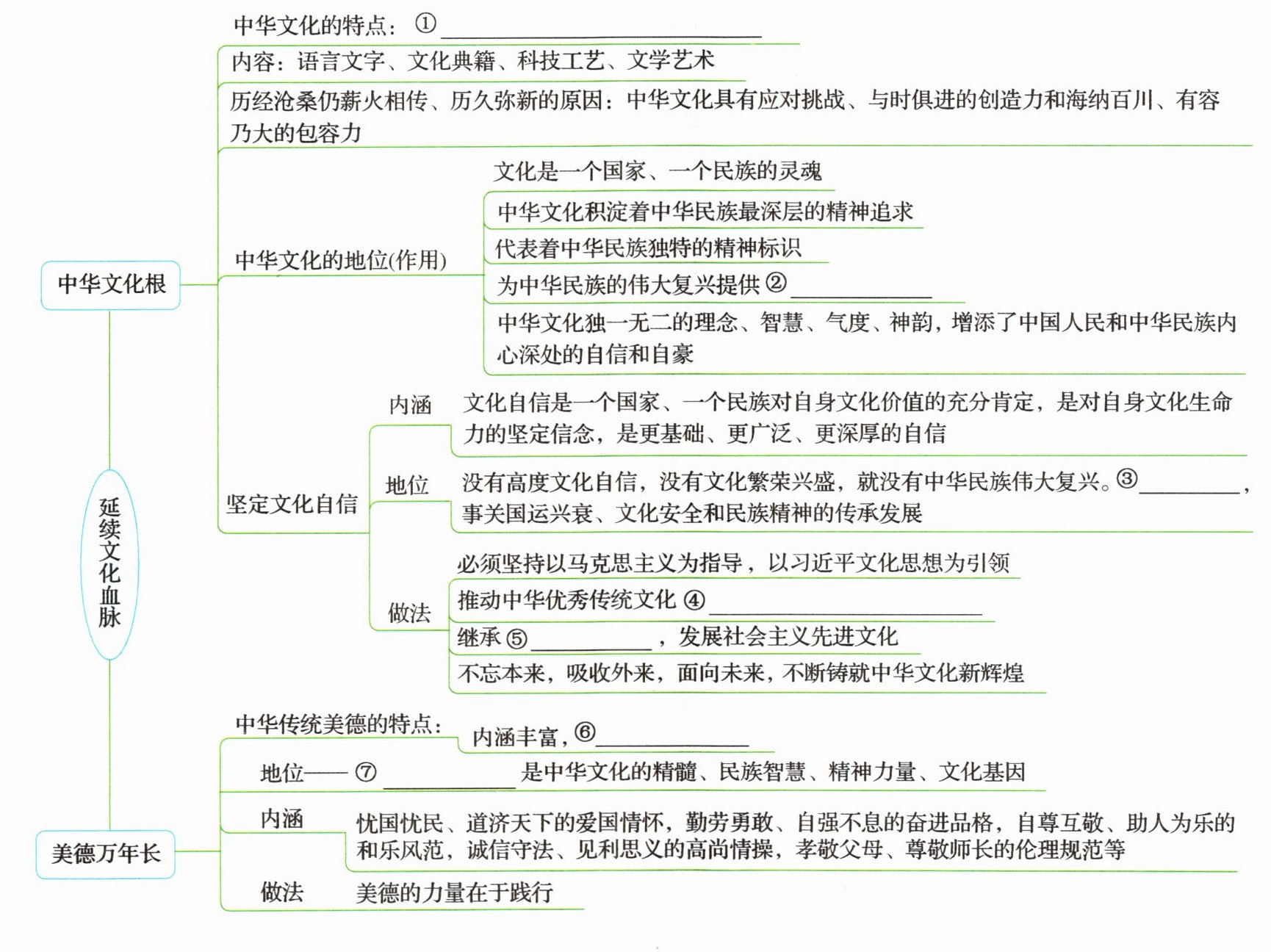 ①源远流长、博大精深 ②精神动力 ③坚定文化 ④创造性转化、创新性发展 ⑤革命文化 ⑥博大精深 ⑦中华传统美德