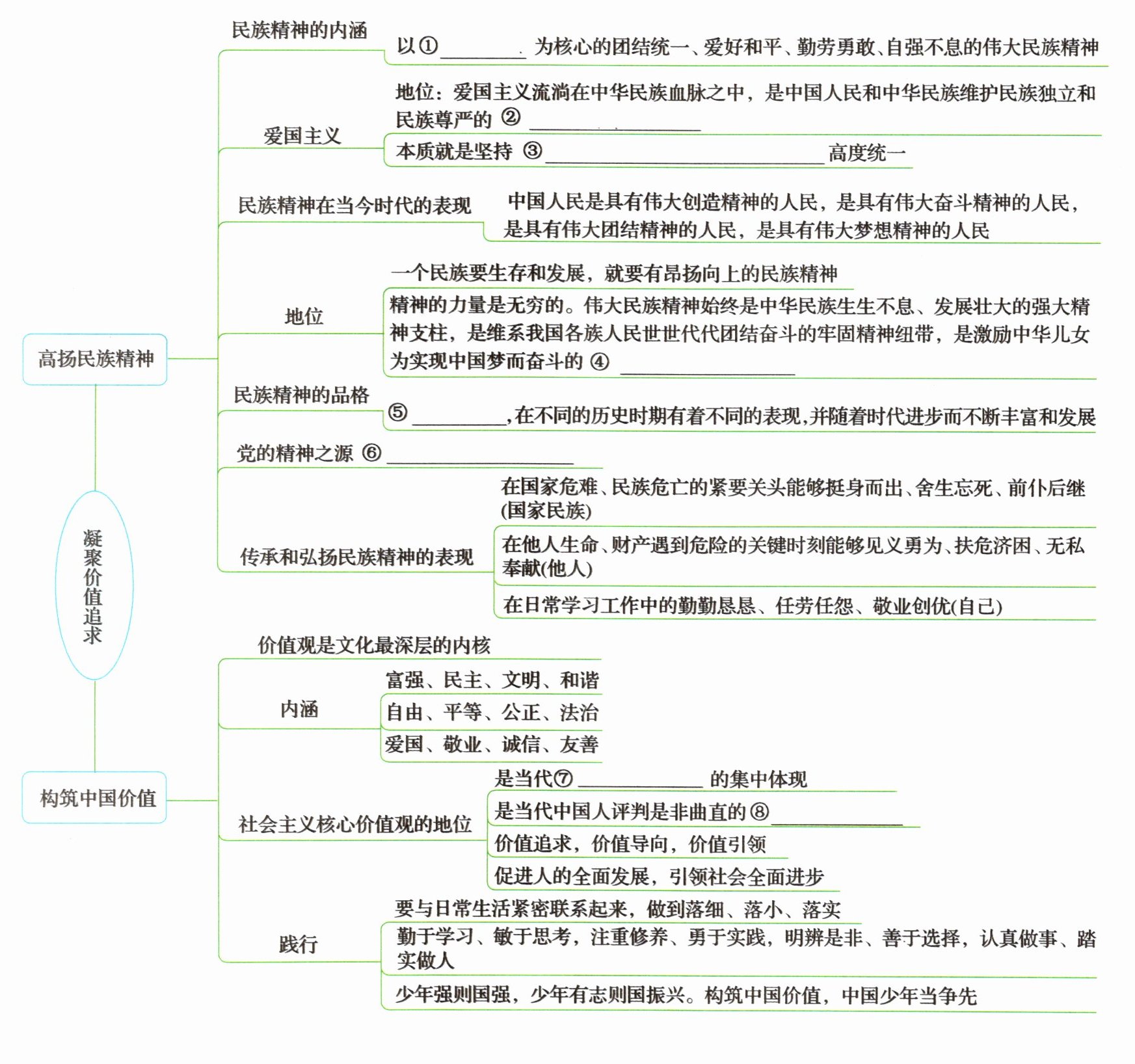 答案: ①爱国主义 ②强大精神动力 ③爱国和爱党、爱社会主义 ④不竭精神动力 ⑤与时俱进 ⑥伟大建党精神 ⑦中国精神 ⑧价值标准