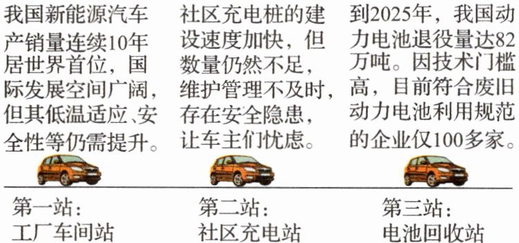 (2)示例:①新能源汽车发展要贯彻落实创新、协调、绿色、开放、共享的新发展理念,实现高质量发展;②新能源汽车发展要践行创新驱动发展战略,提高自主创新能力,解决低温适应和安全性等技术短板问题;③政府应依法行政,发挥管理和服务作用,完善新能源汽车的配套相关基础设施建设;④社区发挥基层居民自治作用,完善日常服务和宣传教育,提升人们的安全意识;⑤新能源汽车企业要发挥科技创新主体地位,优化产业结构,转换经济增长方式,实现产学研深度融合;⑥新能源汽车企业应坚持走绿色发展道路,坚持节约资源和保护环境的基本国策,加强动力电池的循环使用,发挥其在废旧动力电池利用中的作用;⑦新能源汽车企业应积极融入经济全球化,加强国际合作,让中国新能源汽车融入国际市场。