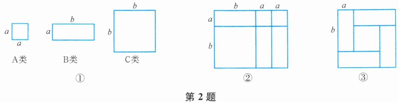 如图①,有边长为 $ a $ 的小正方形,长为 $ b $,宽为 $ a $ 的长方形以及边长为 $ b $ 的大正方形.