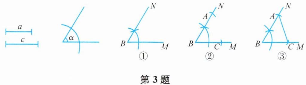 3. 如图,已知线段a,c和∠α,求作△ABC,使BC= a,AB= c,∠ABC= ∠α. 根据作图在下面空格填上适当的文字或字母.