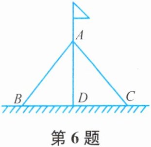 6. 如图,两根长度均为$12m的绳子AB$,$AC$的一端系在与地面垂直的旗杆上,另一端分别固定在地面的两个木桩上,两个木桩离旗杆底部的距离$BD与CD$相等吗?请说明理由.