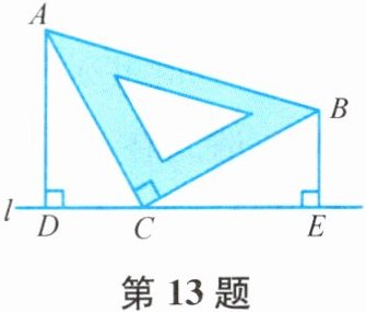 13. 如图,小明有一块三角板$ABC$,其中$\angle ACB = 90^{\circ}$,$AC = BC$,过点$C作直线l$,分别过点$A$,$B作l$的垂线,垂足是分别点$D$,$E$.