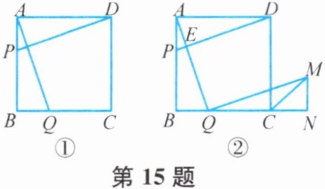 15. 如图①,在四边形$ABCD$中,$AB = BC = CD = AD = 4\mathrm{cm}$,$\angle BAD = \angle B = \angle C = \angle ADC = 90^{\circ}$,点$P以1\mathrm{cm/s}的速度自点A向终点B$运动,点$Q同时以1\mathrm{cm/s}的速度自点B向终点C$运动,连接$AQ$,$DP$,设运动时间为$t\mathrm{s}$.