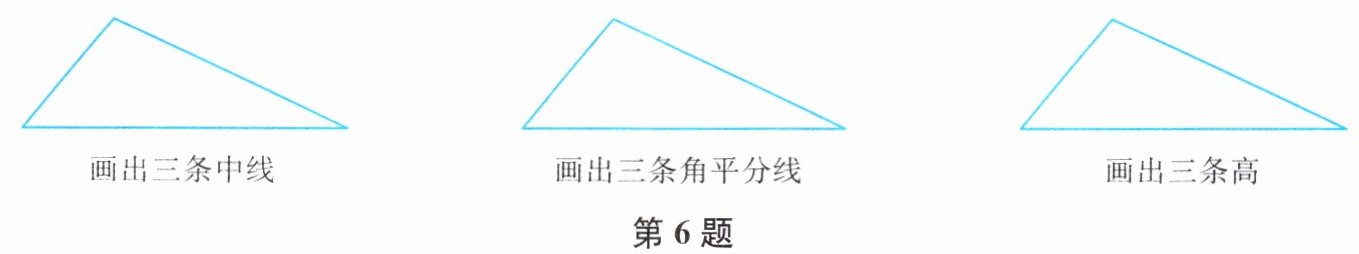 6. 下面给出了三个相同的钝角三角形,分别在这三个三角形中画出三角形的三条中线、三条角平分线、三条高.