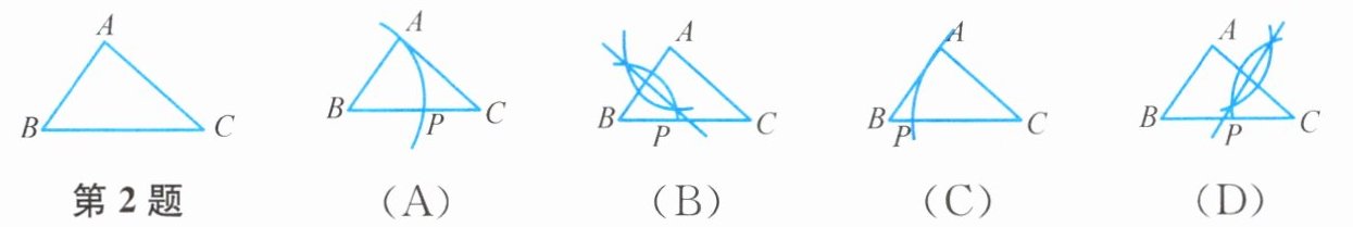 2. 如图,已知$ \triangle ABC $,$ AB < BC $,用尺规作图的方法在$ BC 上取一点 P 使得 PA + PC = BC $,则下列选项正确的是(