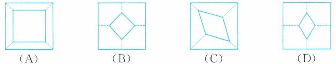 2. 如图,将一张正方形纸片沿步骤①②中的虚线对折两次,然后沿步骤③中平行于底边的虚线剪去一个角,展开铺平后的图形是(
