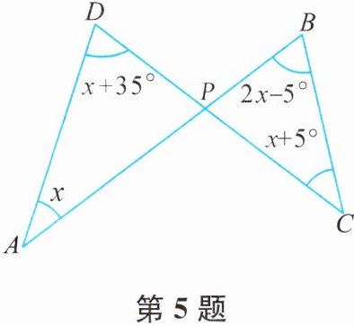 5. 如图,$AB与CD相交于点P$. 求$∠A$的度数.